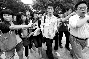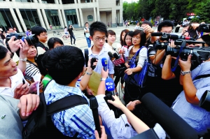 李戡戴著黑邊眼鏡,身穿藍色豎條的白底襯衫、黑色褲子,不茍言笑。他像一塊磁石一樣吸引著攝像鏡頭和錄音筆,從報到、辦理飯卡到宿舍,再到校外,李戡一直在不停地回答著記者的問題。