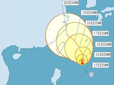 截至15日晚10時(shí)為止,輕臺(tái)凡那比的中心位置在恒春東方700公里海面上,以時(shí)速10公里速度向北北西轉(zhuǎn)北方移動(dòng)。