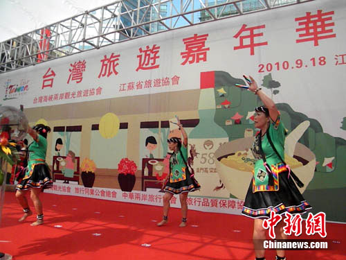 中新網(wǎng)南京9月18日電(記者 唐娟)18日,臺(tái)灣海峽兩岸觀光旅游協(xié)會(huì)(簡(jiǎn)稱臺(tái)旅會(huì))在南京舉行“臺(tái)灣旅游嘉年華”。這是臺(tái)旅會(huì)在大陸首度舉辦的戶外嘉年華推廣活動(dòng)。在此間上午的嘉年華盛會(huì)上,臺(tái)灣藝術(shù)家們熱情火辣的原住民歌舞表演,將現(xiàn)場(chǎng)氣氛推至高潮。