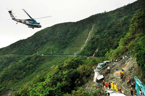 空援同時,臺軍特種作戰(zhàn)部隊、消防部門特種搜救隊都出動,“公路總局”以重型機具清道,只是山坡壁已成泥石漿,才一挖,旁壁的土石又流下,如此重復施作,最后終于勉強清出一條便道。