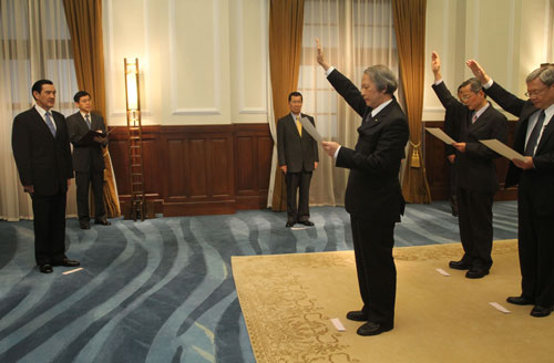 據(jù)報道,馬英九25日上午出席新任“司法院”、“考試院”政務(wù)人員宣誓典禮,并擔(dān)任監(jiān)誓。宣誓官員包括“司法院長”賴浩敏、“副院長”蘇永欽、“最高行政法院院長”蔡進田、“考試院考試委員”張明珠、“考試院考試委員”高永光、“司法院秘書長”林錦芳、“公務(wù)人員保障暨培訓(xùn)委員會主任委員”蔡璧煌共7人。