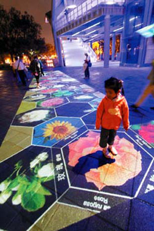 投影光雕有五個互動設(shè)計,測試階段只展演“花語寄情”,一踩在投影花苞上,玫瑰、向日葵、茶花、梅花等花卉就會瞬間盛開,還會出現(xiàn)花卉信息,朵朵投影互動花海,恰與一旁地景花!罢婊ā毙纬捎腥Ρ。