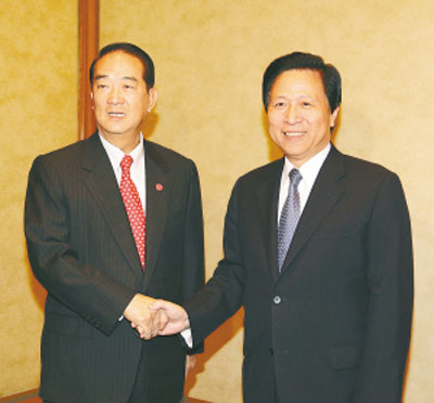 11月1日晚,中共江蘇省委書記、省人大常委會主任梁保華在南京金陵飯店會見了親民黨主席宋楚瑜和副主席張昭雄一行。中共江蘇省委副書記、省長羅志軍,海峽兩岸關(guān)系協(xié)會常務(wù)副會長李炳才,中共江蘇省委常委、南京市委書記朱善璐一同參加會見。