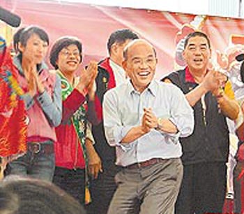 中新網(wǎng)11月14日電 民進黨臺北巿長候選人蘇貞昌13日出席松山霞海城隍廟活動,受邀與五路財神一起跳Nobody舞,但他脫了西裝外套,跳出來的舞步卻是Sorry Sorry舞,現(xiàn)場high翻天。