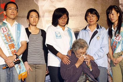 無獨(dú)有偶,“招妓”話題如影隨行的扁子陳致中,在其競(jìng)選總部門口舉辦“來不及說再見,陳水扁坐監(jiān)惜別晚會(huì)”,為自己的選舉拉抬聲勢(shì)。晚會(huì)組織者露出口風(fēng):不排除讓扁媽當(dāng)眾下跪。雖然最終扁媽沒有下跪催票,但扁家人哭成一團(tuán)的場(chǎng)景仍就是綠營(yíng)的一大妙招。