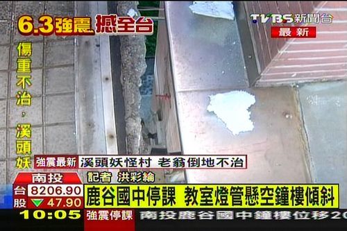 中新網(wǎng)6月3日電 據(jù)臺灣TVBS網(wǎng)站報道,6月2日13時43分,臺灣南投縣(北緯23.9度,東經(jīng)120.9度)發(fā)生6.7級地震(臺灣島內(nèi)氣象部門測定為6.3級),震源深度9.0公里。南投鹿谷中學也受到地震影響,校園內(nèi)多處毀損,3日停課一天。