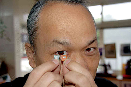 一個(gè)小小的針眼里居然可以容納五只“大熊貓”。這是臺(tái)灣著名微雕藝術(shù)家陳逢顯為迎接2008北京奧運(yùn)會(huì)而創(chuàng)作的最新力作。這五只在奧運(yùn)五環(huán)中的“熊貓”身高只有0.7毫米。     中新社發(fā) 陳立宇 攝