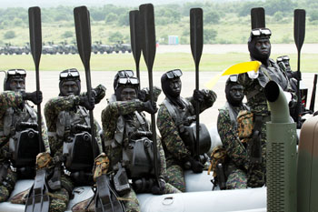 臺(tái)軍方19日在新竹湖口營(yíng)區(qū)實(shí)施“雙十”操演預(yù)演。地面部隊(duì)進(jìn)行行軍及裝備陳展等科目,圖為臺(tái)海軍兩棲偵搜部隊(duì)。來(lái)源:“中央社”