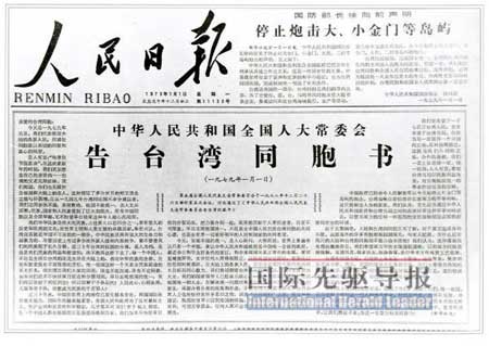 良好的國內(nèi)外氛圍催生了《告臺(tái)灣同胞書》。這是《人民日?qǐng)?bào)》頭版頭條送給兩岸同胞的新年大禮,短短1900字,融化了兩岸30年的堅(jiān)冰。