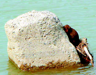 據(jù)臺灣聯(lián)合報報道,林務局工作站人員昨天上午經(jīng)過高雄縣旗山鎮(zhèn)旗尾溪,發(fā)現(xiàn)有只臺灣小獼猴受困溪中,緊抱著溪中大石面對滾滾洪流動彈不得。
