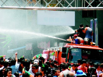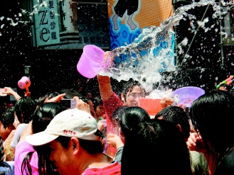 中新網(wǎng)4月13日電 臺(tái)灣臺(tái)北縣“中和市2009潑水節(jié)”昨天上午在南勢角捷運(yùn)站盛大登場,民眾拿著水槍、水瓢、水桶到處噴灑開戰(zhàn),臺(tái)北縣消防局也調(diào)派兩輛消防水車加入戰(zhàn)局,超強(qiáng)水柱掃射現(xiàn)場民眾,讓民眾遇水則發(fā),氣氛夯到最高點(diǎn),樂到不行。