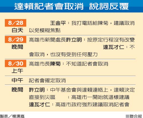 達(dá)賴記者會(huì)辦不辦成30日焦點(diǎn),陳菊30日上午受訪時(shí)還堅(jiān)稱記者會(huì)照舊,直到達(dá)賴方面表示取消后,才對(duì)外說(shuō)“直赴災(zāi)區(qū)原就是她的建議行程”,引起外界質(zhì)疑是高雄市府事后“自圓其說(shuō)”。