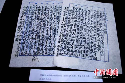 據(jù)了解,紅巖革命歷史博物館此次展示的489篇蔣介石日記,共計(jì)82254字,大多寫(xiě)于解放前夕,由相關(guān)工作人員抄錄于美國(guó)國(guó)家檔案館。據(jù)紅巖革命歷史博物館館長(zhǎng)厲華介紹,部分史料記錄了毛澤東赴重慶談判時(shí),與蔣介石數(shù)次單獨(dú)會(huì)晤及談話(huà)的大致內(nèi)容。