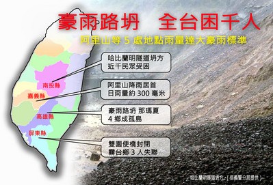 截至23日晚間9點(diǎn),全臺降雨前五名地區(qū)分別是阿里山287毫米、高雄縣桃源鄉(xiāng)御油山241毫米、南投信義鄉(xiāng)神木村218毫米、臺中縣和平鄉(xiāng)雪嶺211毫米、高雄縣桃源鄉(xiāng)溪南211毫米,都達(dá)到大暴雨標(biāo)準(zhǔn)(24小時累積雨量達(dá)200毫米以上)。