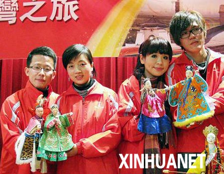 1月14日,兩岸新人在體驗臺灣布袋戲時合影留念。來自大陸的26對新人搭乘兩岸直航班機來到臺灣,將參加于1月15日在日月潭舉行的“日月同喜,喜傳天下”集體婚禮并游覽臺灣名勝古跡,感受當?shù)仫L土人情。新華社圖