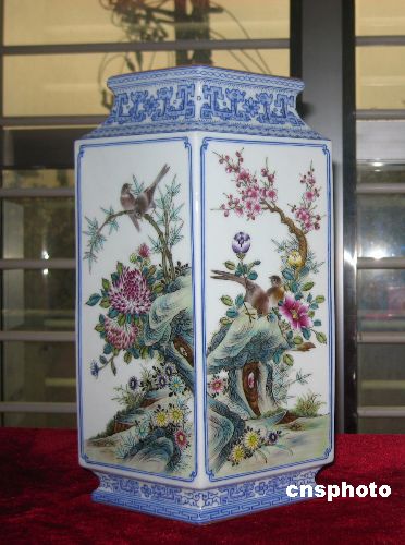 仿清乾隆粉彩開光花鳥棱形瓶。這是20件"海峽兩岸國寶珍瓷高仿精品"之一,高32.3厘米,口徑15.2X9.8厘米,腹徑19.5X12.5厘米,足徑18X11.8厘米。原件現(xiàn)藏于臺北故宮博物院,在原產(chǎn)地景德鎮(zhèn)仿制,售價17600元人民幣。