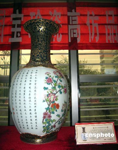 仿清乾隆粉彩霽藍描金花卉詩句大瓶。這是20件"海峽兩岸國寶珍瓷高仿精品"之一,高36.5厘米,口徑22.5厘米,腹徑33厘米,足徑21厘米。原件藏于北京故宮博物院,在原產(chǎn)地景德鎮(zhèn)仿制,售價39800元人民幣,是該批高仿精品中價格最高的珍瓷。