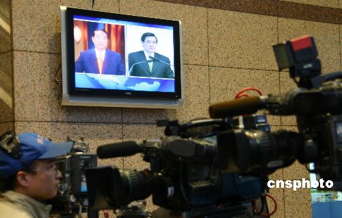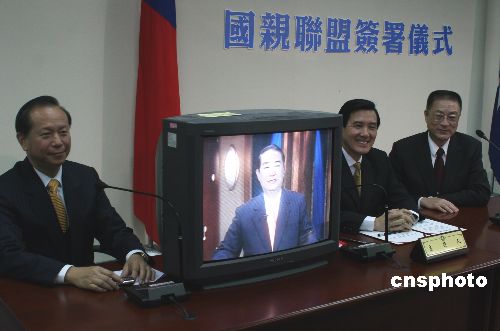 圖為協(xié)議簽署前的情形,左一為親民黨秘書長(zhǎng)秦金生,右一為國(guó)民黨秘書長(zhǎng)吳敦義。中新社發(fā) 黃少華 攝