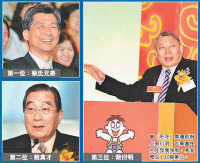 今年上榜富豪中僅5人錄得資產(chǎn)增長(zhǎng),當(dāng)中3人得益于大陸業(yè)務(wù)發(fā)展!按筅A家”是旺旺集團(tuán)創(chuàng)辦人蔡衍明,集團(tuán)在大陸發(fā)展強(qiáng)勁,身家急漲10億美元,排名從第9名跳升至第3名。另一食品集團(tuán)康師傅的創(chuàng)辦人魏應(yīng)州,身家也大增5.5億美元,升至第5名。