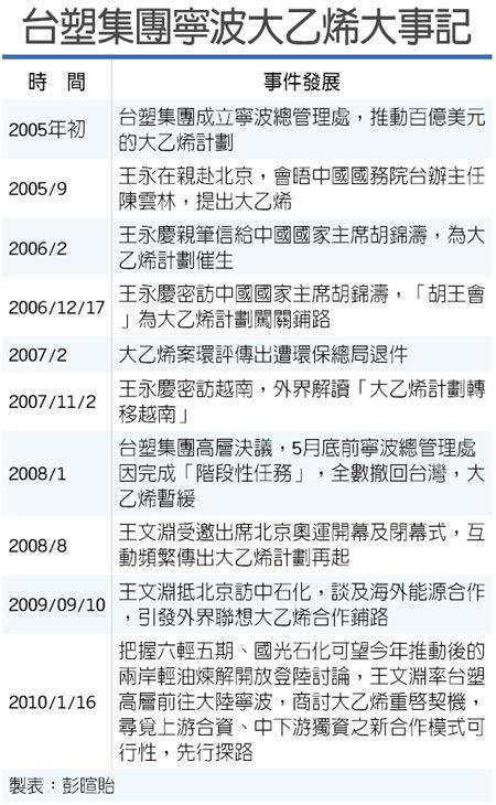 “大乙烯計(jì)劃”原是臺塑寧波石化的二期專案,包括年產(chǎn)1,000萬噸的煉油、年產(chǎn)120萬噸的乙烯裂解廠,60萬噸的丙烯廠、16.7萬噸的丁二烯廠,以及芳香烴系列,投資總額是100億美元,是臺塑集團(tuán)創(chuàng)辦人王永慶先前積極推動的登陸投資案。