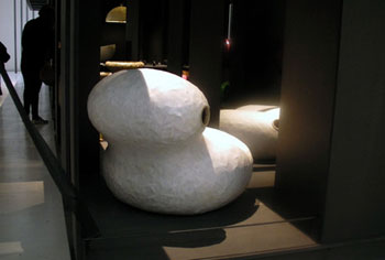 王俊隆還費(fèi)時2年半研究“作繭計(jì)劃”制成“蠶繭沙發(fā)”,王俊隆就此作品表示,記起小時候?匆娪腥硕敷移屏,就在夜間放蠶寶寶在斗笠破處,隔天蠶寶寶便會吐絲把斗笠破洞修補(bǔ)好,因此他不斷實(shí)驗(yàn),讓5000只蠶寶寶在竹編沙發(fā)上吐絲,把沙發(fā)的2個橢圓型,包覆成2個巨大的蠶蛹。