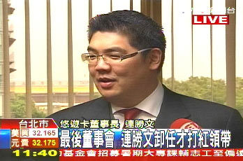 中新網(wǎng)5月27日電 據(jù)臺灣TVBS電視臺報(bào)道,悠游卡公司董事長連勝文,因?yàn)榻】翟蛘堔o,今天是最后一次主持董事會(huì),主持的是自己與新董事長劉奕成的交接,連勝文特別打上紅領(lǐng)帶,笑說自己任職1年9個(gè)多月,今天第一回挑紅色,因?yàn)閷?shí)在太開心了。