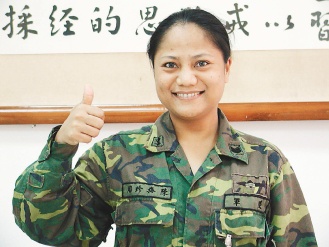 38歲陳梅珍從小想當護士,中學(xué)畢業(yè)考上護專,但學(xué)費貴,家里無力負擔。念完高中后,為減輕父母負擔,入伍成為臺軍首批志愿役女士官,F(xiàn)在是陸軍空降訓(xùn)練中心士官長,去年協(xié)助訓(xùn)練連上人員,獲得“莒光連隊”殊榮。