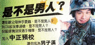 中新網(wǎng)4月8日電 據(jù)臺灣《聯(lián)合報》報道,只有男人才能念軍校?臺當局“國防部”中正預(yù)校今年的招生廣告,斗大的標題《是不是男人?》讓民代薛凌痛批軍方性別歧視,貶抑女性。