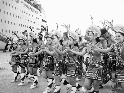 13日,安利團(tuán)員乘坐的郵輪停靠花蓮港口。早晨7時,已經(jīng)有花蓮原住民阿美族的姑娘小伙身著盛裝,在港口用歌聲和舞蹈歡迎大陸來的客人。