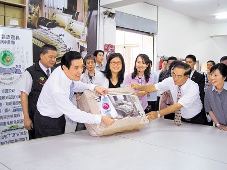 昨天上午,馬英九在“陸委會”主委賴幸媛的陪同下,到臺南市安平工業(yè)區(qū)參觀傳統(tǒng)產(chǎn)業(yè)億進(jìn)寢具公司,馬英九、賴幸媛等官員參觀寢具的制造過程中,馬英九還親自踩縫紉機(jī)、燙棉被,感受傳產(chǎn)勞工的辛苦后,隨即和來自各縣市的四十五位傳統(tǒng)業(yè)者代表座談。