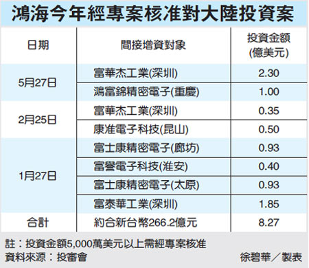 中新網(wǎng)5月28日電 據(jù)臺灣《經(jīng)濟(jì)日報(bào)》報(bào)道,臺當(dāng)局“經(jīng)濟(jì)部”投審會昨(27)日通過兩件鴻海集團(tuán)對大陸增資案,總計(jì)3.3億美元,約新臺幣106.2億元。一件是間接對富華杰工業(yè)(深圳)增資2.3億美元,另一件是對鴻富錦精密電子(重慶)間接增資1億美元。