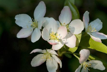 蘋果花花苞外側(cè)為粉紅色,粉嫩粉嫩的,張開(kāi)的花朵則有些是純潔的白色,有些則還帶有一些些粉紅,好像情竇初開(kāi)的少女,嬌羞嫵媚。