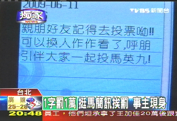 據(jù)臺(tái)灣TVBS電視臺(tái)報(bào)道,去年臺(tái)灣地區(qū)領(lǐng)導(dǎo)人選舉投票當(dāng)天,一名馬英九支持者發(fā)送了一則50字短信幫馬助選,事后因違反島內(nèi)選舉規(guī)定,被罰50萬(wàn)元(新臺(tái)幣,下同),成為臺(tái)灣史上最貴的短信,1字等于1萬(wàn)元。這名男子黎煌雷昨天接受媒體訪問(wèn),認(rèn)為傳短信是私人行為,并沒(méi)有公開(kāi)助選,因此不服處罰。