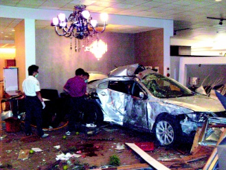 據(jù)臺(tái)灣《聯(lián)合報(bào)》報(bào)道,位于蘭陽大橋南端的家具行前晚11時(shí)許還在營業(yè),店員正帶客人看家具,突然聽到“吱”一聲尖銳摩擦聲,接著“轟”的一聲,整臺(tái)銀色小轎車側(cè)撞進(jìn)來,迎路整片落地玻璃撞碎,家具被撞飛,霹靂啪啦一片狼藉。