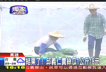 中新網(wǎng)7月20日電 據(jù)臺(tái)灣TVBS報(bào)道,臺(tái)當(dāng)局前“國(guó)安會(huì)秘書長(zhǎng)”邱義仁5月初南下高雄務(wù)農(nóng),經(jīng)過(guò)2個(gè)多月,他種的絲瓜現(xiàn)在已經(jīng)結(jié)實(shí)累累,3天前邱義仁開(kāi)始采收,10多箱的絲瓜經(jīng)由產(chǎn)銷班賣到臺(tái)北,1公斤的價(jià)格大概新臺(tái)幣18元,邱義仁的好友戴振耀說(shuō),受到臺(tái)風(fēng)影響,價(jià)格不算好,不過(guò)總算是邱義仁當(dāng)農(nóng)夫交出的第一張成績(jī)單。