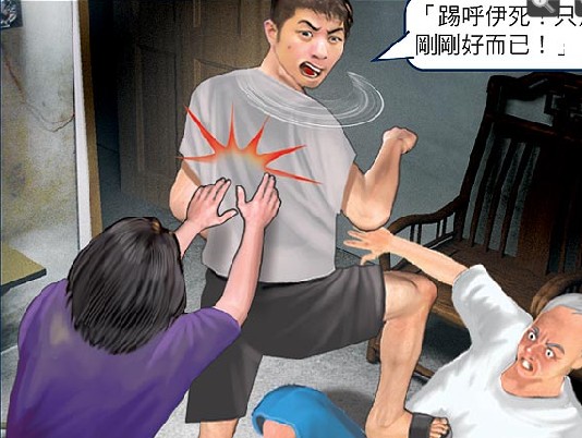 沈父倒在地上不斷哀號(hào),在房?jī)?nèi)睡覺(jué)的沈弘隆姑姑趕緊跑出來(lái)察看,大喊:“不要打了!”一把將侄子推開(kāi)說(shuō):“當(dāng)兒子的,怎么可以打老爸。”但沈弘隆失去理性,還回嗆姑姑說(shuō):“踢呼伊死(指沈父)!只是剛剛好而已!”甚至拉開(kāi)姑姑,再踢了父親一腳,才掉頭逃離現(xiàn)場(chǎng)。