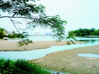 澄清湖因高屏溪原水濁度太高,且攔河堰抽水設(shè)備受損,已十天無法進水。水位從滿水位銳降至十六點五米呆水位,有效蓄水量僅剩四十多萬公噸,水庫處處可見裸露底泥的大片沙洲。