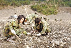 新開部落迄今仍有二十五位罹難者被掩埋在三層樓高的土石堆,前天臺軍在韓籍救難隊員指導(dǎo)下,趴在土石堆上,試圖循著臭味發(fā)現(xiàn)遺體。