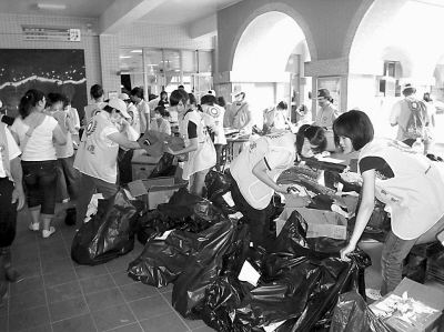 在熱心志工的引導(dǎo)下,我們進(jìn)入旗山社會(huì)福利館。這兒似乎被一個(gè)社會(huì)團(tuán)體的志工包下了,統(tǒng)一的黃色馬甲顯得整齊,記者在人群中明顯不一樣。一間大房間作為庫房,不同的物資碼放整齊。更多的人忙著將一袋袋捐贈(zèng)衣物分門別類,新的舊的,長(zhǎng)的短的,厚的薄的,男的女的,然后消毒、打包、標(biāo)號(hào),送往災(zāi)民安置點(diǎn)。