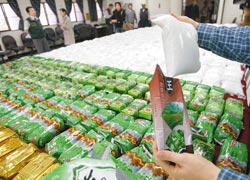 調(diào)查人員見(jiàn)狀立即上前將人、車扣留,并上船搜索,隨即在漁船前艙發(fā)現(xiàn)一密室,打開(kāi)發(fā)現(xiàn)成堆K他命,分裝在茶葉、食品、飼料等不同產(chǎn)品袋子中,企圖魚(yú)目混珠。經(jīng)清查后共有K他命成品八百四十七公斤,估計(jì)黑市價(jià)格高達(dá)十億元,是島內(nèi)最大宗K他命走私案。