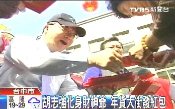 再過幾天就是農(nóng)歷春節(jié),臺中天津路年貨大街為了增加人氣,請胡志強發(fā)紅包,民眾大排長龍,不少小朋友領到市長紅包,嘴巴也變甜了,“祝市長新年快樂,年年有余,大吉大利!”還有一位阿伯為了見到胡志強,連續(xù)3年都來領紅包。