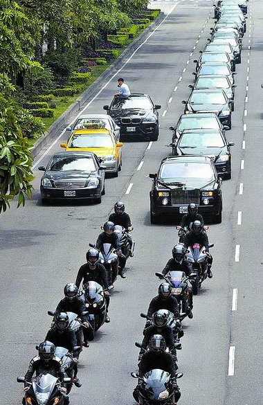昨迎靈隊伍由12輛黑色重型摩托車前導(dǎo),36輛勞斯萊斯、奔馳、BMW等名車從喪宅出發(fā),車隊浩浩蕩蕩綿延逾一公里,引人側(cè)目。