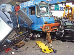 中新網(wǎng)4月17日電 據(jù)臺灣《中國時報》報道,臺灣男子呂昭明十六日傍晚駕駛二十噸吊車,疑因剎車失靈,連續(xù)追撞十一輛汽車及摩托車,導致騎摩托車的母親蔡阿櫻重傷、讀高中的女兒陳亭婷與初中的兒子陳柏翰當場死亡,另有五人輕傷,車禍現(xiàn)場怵目驚心。