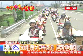 中新網(wǎng)4月19日電 據(jù)TVBS報(bào)道,大甲媽祖繞境,今天有一整排摩托車騎士要從大甲出發(fā),趕路到新港,車陣綿延了1、2公里之長(zhǎng),共約300臺(tái),有秩序地排列著,也號(hào)稱是三百壯騎。