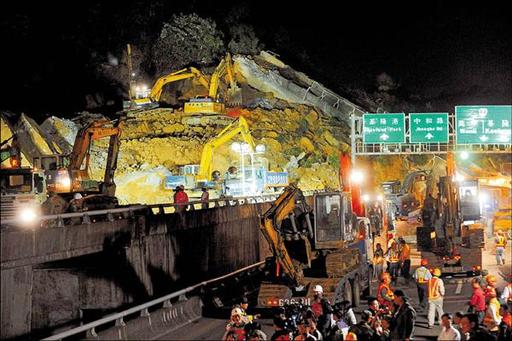 由于土石量太大,總重超過20萬噸,臺(tái)灣“高速公路局長(zhǎng)”曾大仁表示,將全面搶修,希望兩周內(nèi)清理完土石,搶通可能需20日以上;不過軍方搶救人員昨晚接到軍方高層最新指令,要求一周內(nèi)全力搶通。