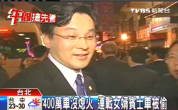 現在失竊率高,連戰(zhàn)的女婿陳弘元也遭殃,上周五,陳弘元和妹妹,到新竹竹東鎮(zhèn)拜訪易經老師,趁著空檔,司機開黑色奔馳車到超商繳停車費,一時疏忽,車子沒有熄火,短短幾分鐘,車子被兩名歹徒開走。