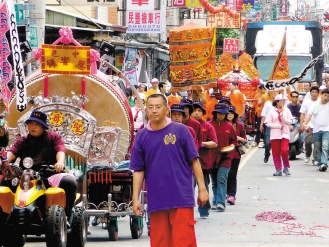 中午時(shí)分,臺(tái)北縣圣母宮的10輛游覽車又載另一批信眾來(lái)到,加上隨行自己開(kāi)車的信眾,人車將延平老街?jǐn)D得滿滿的;廟前進(jìn)香后,到廟后臨時(shí)搭建的棚架下吃午餐,信眾就這樣進(jìn)出一下午。