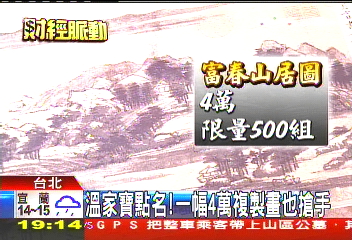 中新網4月24日電 據(jù)臺灣TVBS報道,2010臺北禮品展開跑,臺北故宮今年第3次參展,也是規(guī)模最大一次。此次臺北故宮特別把溫家寶提過的富春山居圖制作成復刻板,限量500套,雖然一幅4萬元(新臺幣,下同),但一開賣就被訂走50套。