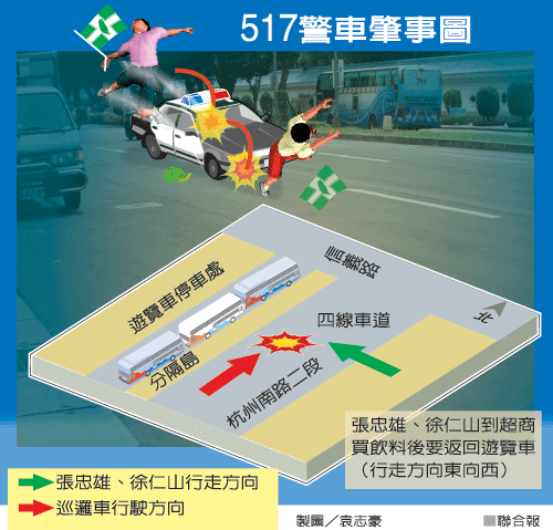 張忠雄、徐仁山在跨越杭州南路車道時,突遭同由杭州南路南向北行駛的巡邏車撞上,張忠雄被撞后彈落到巡邏車擋風(fēng)玻璃上,再滾落地面。由于撞擊力大,巡邏車的擋風(fēng)玻璃碎裂,原本行駛在內(nèi)側(cè)第二車道的巡邏車,也偏向最內(nèi)車道緊急煞車。
