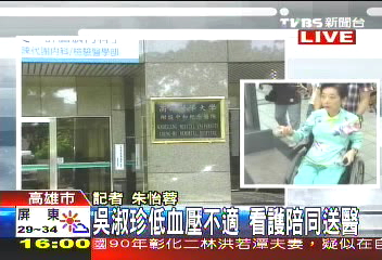 根據(jù)醫(yī)護(hù)人員初步檢查,吳淑珍疑似因?yàn)檫^度勞累而出現(xiàn)血壓過低的情況,住進(jìn)醫(yī)院VIP病房,將接受主治醫(yī)生進(jìn)一步的詳細(xì)檢查。